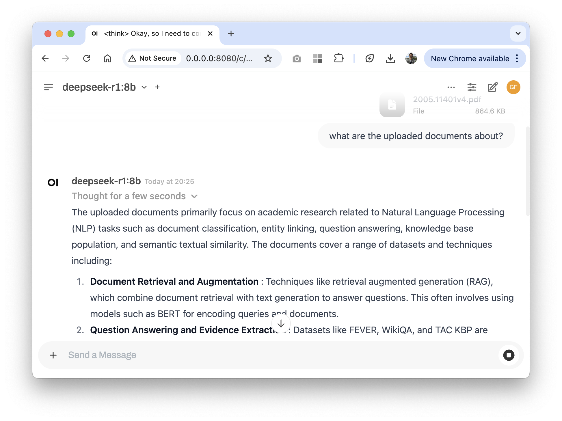 The LLM running on my Mac, Deepseek’s 8 billion parameter model, did a fair job of telling me what the uploaded documents are about.